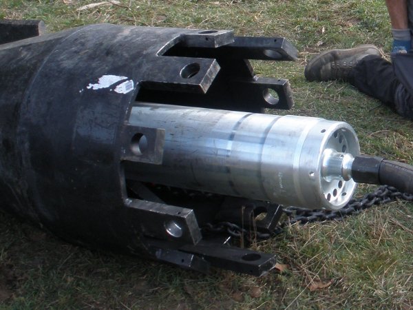 Near by the Spanish capitol Madrid old sewer pipes Ø 400 mm (16”) from concrete had to be replaced by new HDPE pipes OD 500 mm (20”). These new pipes in the quality PE-100 (DN 10) had a wall thickness of 29.7 mm (1.2”). Several sections up to 90 m (300 ft) long had to be replaced. This bursting job was done with the cable burstet TERRA-EXTRACTOR X 400. It’s pulling force of 400 kN (40 tons), 88’000 lbs is obviously too small for such large pipe diameters. Therefore the dynamic bursting sleeve OD 610 mm (24”) was used, which was driven by a TERRA Steel Pipe Ram TR 220. This bursting sleeve is equipped with a patented spring box which keeps the full pulling force at the bursting sleeve even during the return stroke of the X 400. This spring box is tensioned during the power stroke of the X 400 and keeps this pulling force during the return stroke.