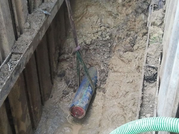 The new HDPE pipe OD 180 mm (7.1”) has been pulled in. This special pipe has an extra protection shell, so it is perfectly suitable for trenchless pipe laying.