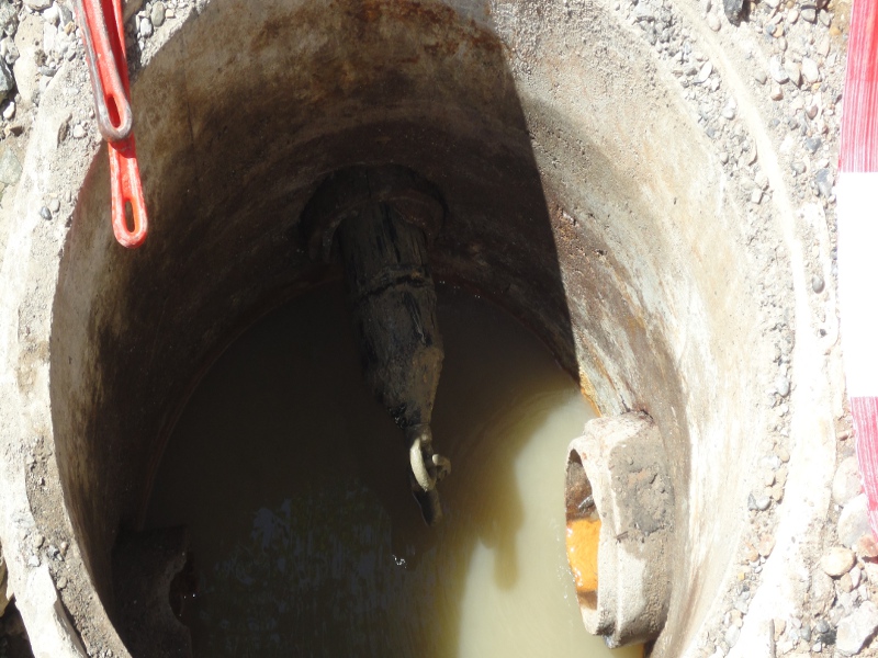 For the renewal of an old sewer line in Hombrechtikon, Switzerland the new Compact Cable Burster TERRA-EXTRACTOR X 300 C was used. The contractor Zehnder Spezialbau from Bennau was responsible. The old clayware pipe was collapsed and had to be renewed over a length of 27 m (90 ft) by calibre bursting. This method uses a calibre head, which calibrates the old pipe to its original diameter and which displaces broken fragments sidewise. Then a new HDPE pipe with a little smaller diameter is pulled in. The sewer line runs underneath a warehouse, therefore the renewal had to be done trenchless. The new pipe had to be pulled in from a manhole. This is why the compact and dismountable TERRA-EXTRACTOR X 300 C was chosen.