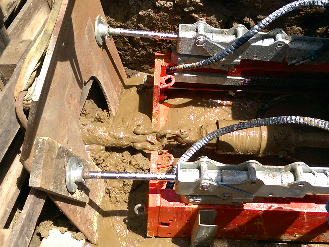 Drillmaster Jürgen Ertl manoeuvers the TERRA-JET DJ 18 PIT. Hydraulic cylinders allow an easy, firm and safe tensioning of the machine in the starting pit. The accumulated Bentonite was sucked out by a mud vacuum suction trailer and disposed accordingly.